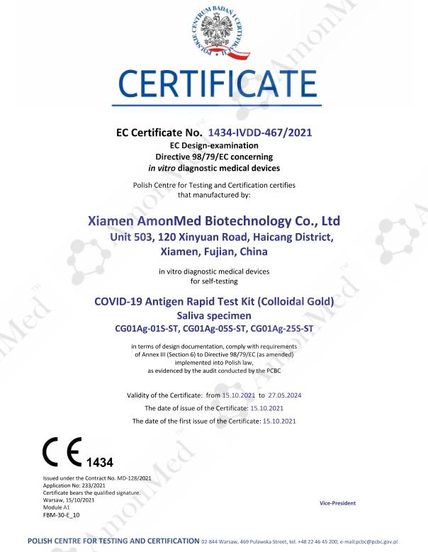 2021年10月15號,波蘭PCBC機(jī)構(gòu)國際公告(公告號1434),正式頒布奧德生物新型冠狀病毒抗原快速檢測試劑盒 (膠體金法)唾液拭子歐盟自測CE認(rèn)證證書。奧德CE證書是按照歐盟8月份頒布的新法規(guī)準(zhǔn)備的技術(shù)文件。