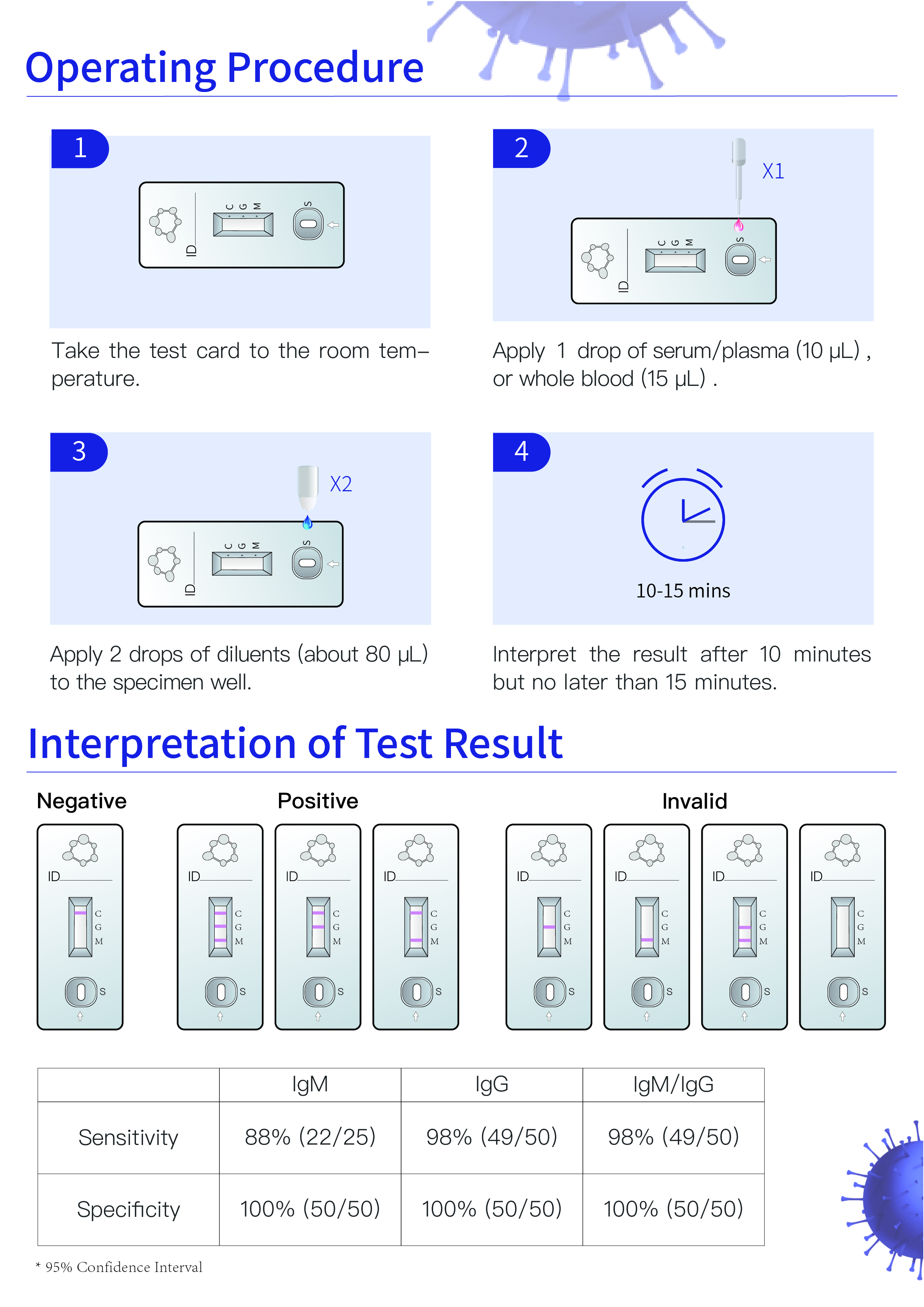 預期用途:本試劑盒用于人血清、血漿、及全血樣本中新型冠狀病毒IgM/IgG抗體的定性檢測。僅可由專業醫護人員操作使用。